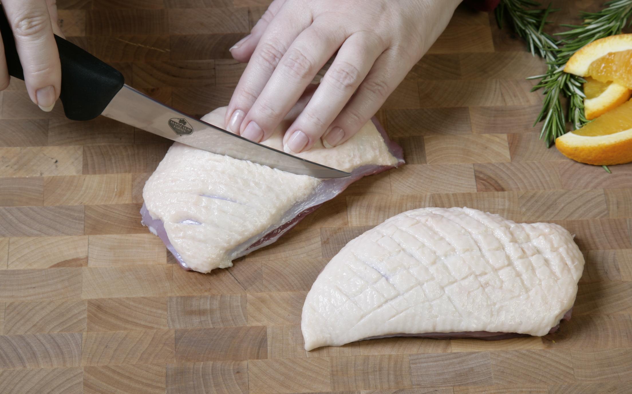 4- قومي بتحضير صدور البط المقطعة وقومي بعمل بعض الفتحات الصغيرة بها بالسكين وضعيها فوق المربي بالصينية أو يمكنك أن تعدي وصفتك الخاصة بأن تضعي البطة كاملة بدلاً من تقطيعها إذا كنتي تحبين تقديمها كاملة على سفرتك